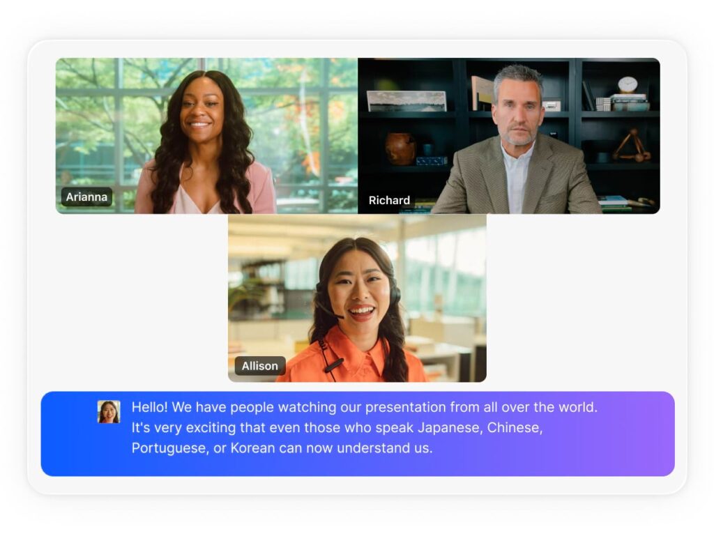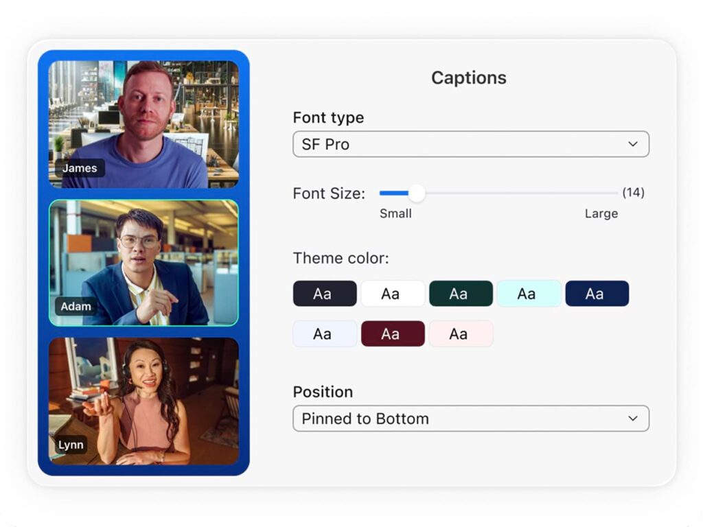 Phụ đề bằng 46 ngôn ngữ giúp xóa bỏ rào cản giao tiếp. Phụ đề đã dịch dành cho các cuộc họp và hội thảo trực tuyến có trong các gói Zoom Workplace Doanh nghiệp lớn và dưới dạng tiện ích mở rộng dành cho các gói Zoom Workplace trả phí khác.