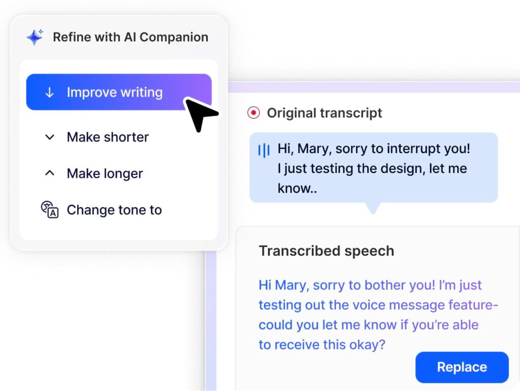 AI chỉnh sửa bản chép lời cùng phần ghi giọng nói để tạo ra văn bản chuyên nghiệp.